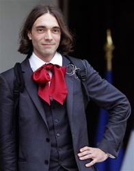 Cedric Villani strikes quite a different figure from Marc Andler. This was hardly surprising: Villani's sartorial originality is not likely to find imitators. As always, he wore a dark blue suit/uniform right out of the 19th century, with a hair-style to match. I've never seen him dressed otherwise. Draped around his neck was a grand maroon scarf.(Sometimes he wears a flamboyant maroon "foulard") His face was intense and withdrawn, with dark rings around cavernous eyes.