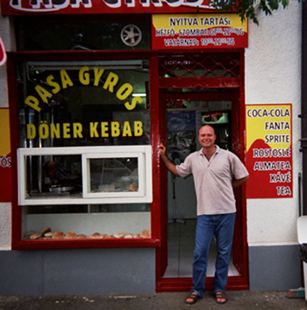"If the rest of my fortunes turn Turk with me! " I cried. The jolly chef did indeed hail from Turkey. He'd ended up in Nyerigyháza via New York City and other privileged way-stations. Tall, blue jeans, pale gray tee shirt, razed pate. The short order café was empty save for its lone employee. I gathered that there was at least one brother helping him out during the long hours posted on the glass of the opened door : 7 AM to 10 PM .